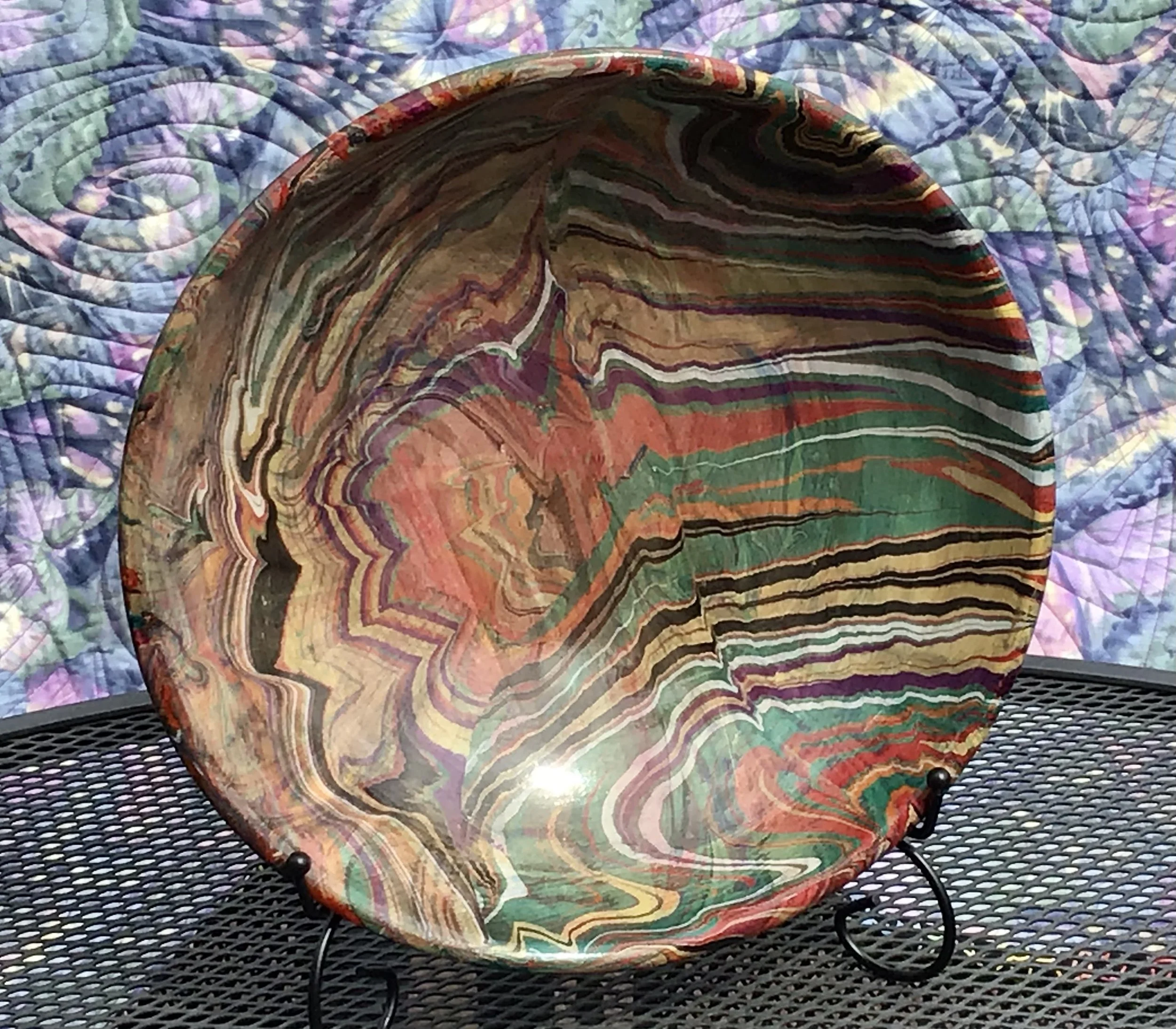 I've been an Ebru Marbler for 27 years, which is a form of printing, but done on water. It is a challenging art form that requires lots of patience, a little science and a little magic. The results are astonishing and I became “addicted to marbling.” I work with many materials including paper, fabric, wood, leather, and weird stuff (feathers, silk flowers, birch bark, etc.).